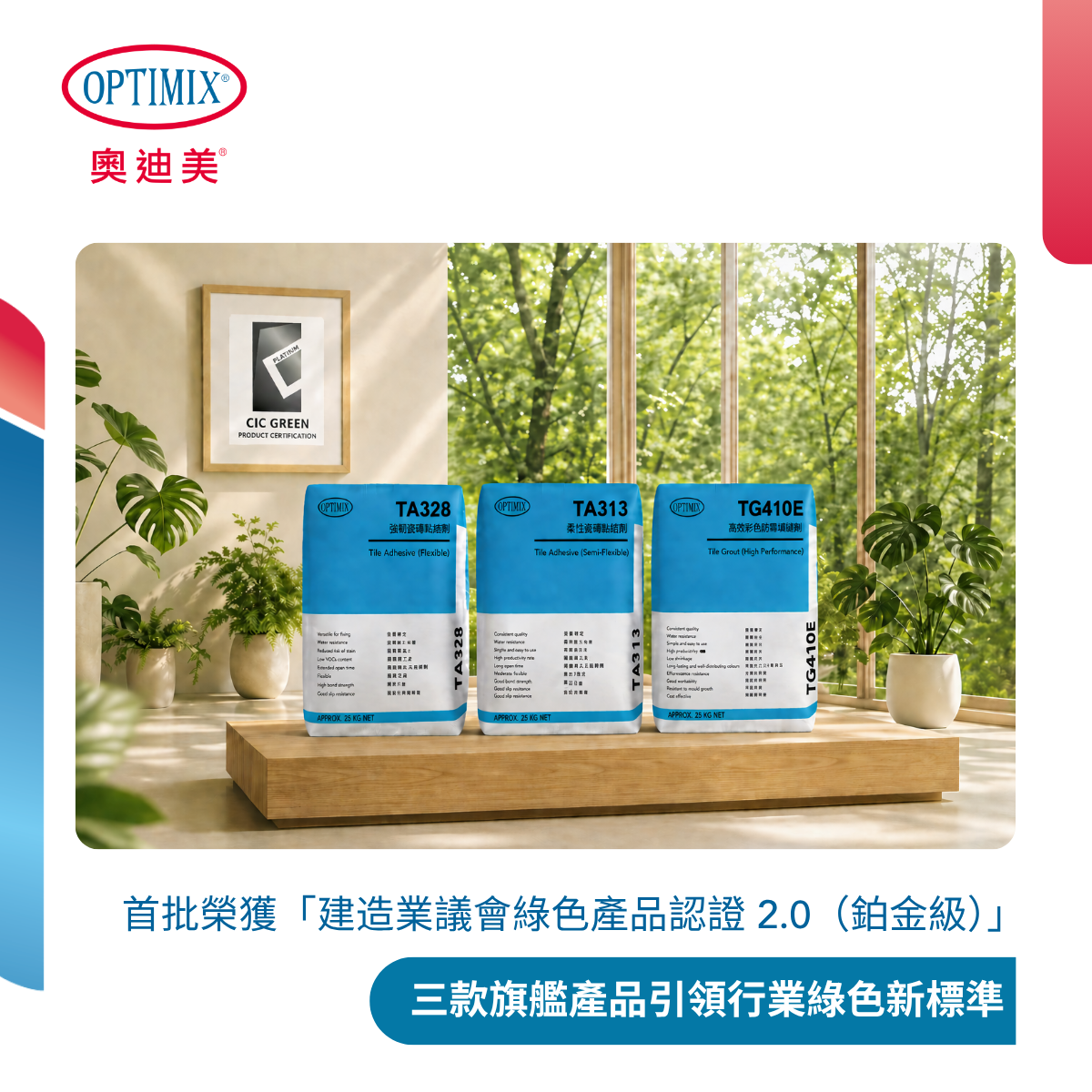 奥迪美再次引领行业绿色标准!旗下三款核心产品——TA313 柔性水泥基粘结剂、TA328 强韧水泥基粘结剂及 TG410E 高性能彩色防霉填缝剂,正式荣获建造业议会(CIC)全新推出的「香港建造业议会绿色产品认证(CICGPC)2.0」之最高级别—铂金级认证。